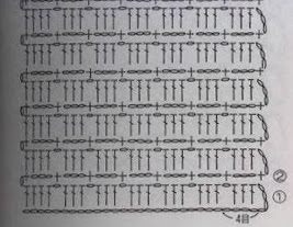 9ª v: 2 p.altos ( en el arco de dos cadenetas ), 2 cadenetas y 2p. altos, 3 cadenetas,1 p. bajo en el siguiente arco de abajo. ( Repetir ).