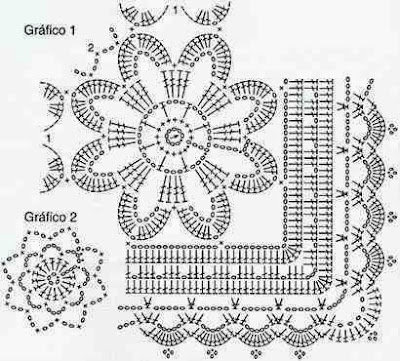 8ª v: En el primer arco de abajo , se hace 1 p. bajo y 1 cadeneta,en el siguiente arco 2 p.altos, 2 cadeneta, 2 p. altos y 1 cadeneta.En el proximo arco 1 p. bajo,3 cadenetas y 1 p. bajo en el siguiente arco. (Repetir).