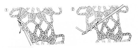 5 cad, 1 p. bajo (en el arco siguiente) 5 cad, 1 p. bajo, (en