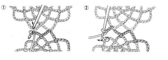 5 cad, 1 p. bajo, (en el arco siguiente) 5 cad. (rep).