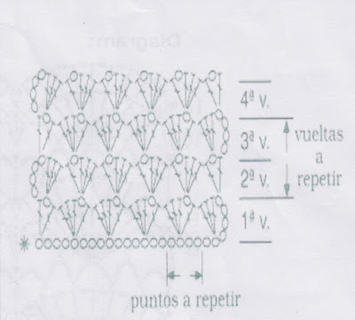 2ª vuelta: 12 p. altos y 2 p. altos, 2cad. 2p. altos (en el arco de abajo), 16 p. altos y 2 p. altos, 2 cad. 2 p. altos (en el arco) 20 p. altos y 2 p. altos, 2 cad., 2 p. altos (en el arco) 16 p. altos y 2 p. altos, 2 cad., 2 p. altos (en el arco) 12 p. altos.