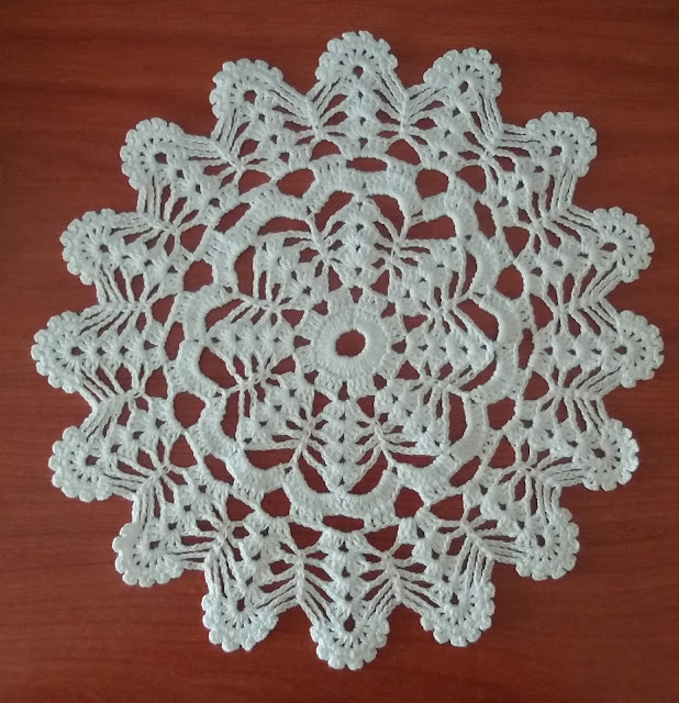 14ª v: 3 p. alt., 2 cad., 3 p. alt.( en el arco de 2 cad.) 4cad., 1 p. bajo ( en el p.bajo de abajo) 4 cad. ( rep)